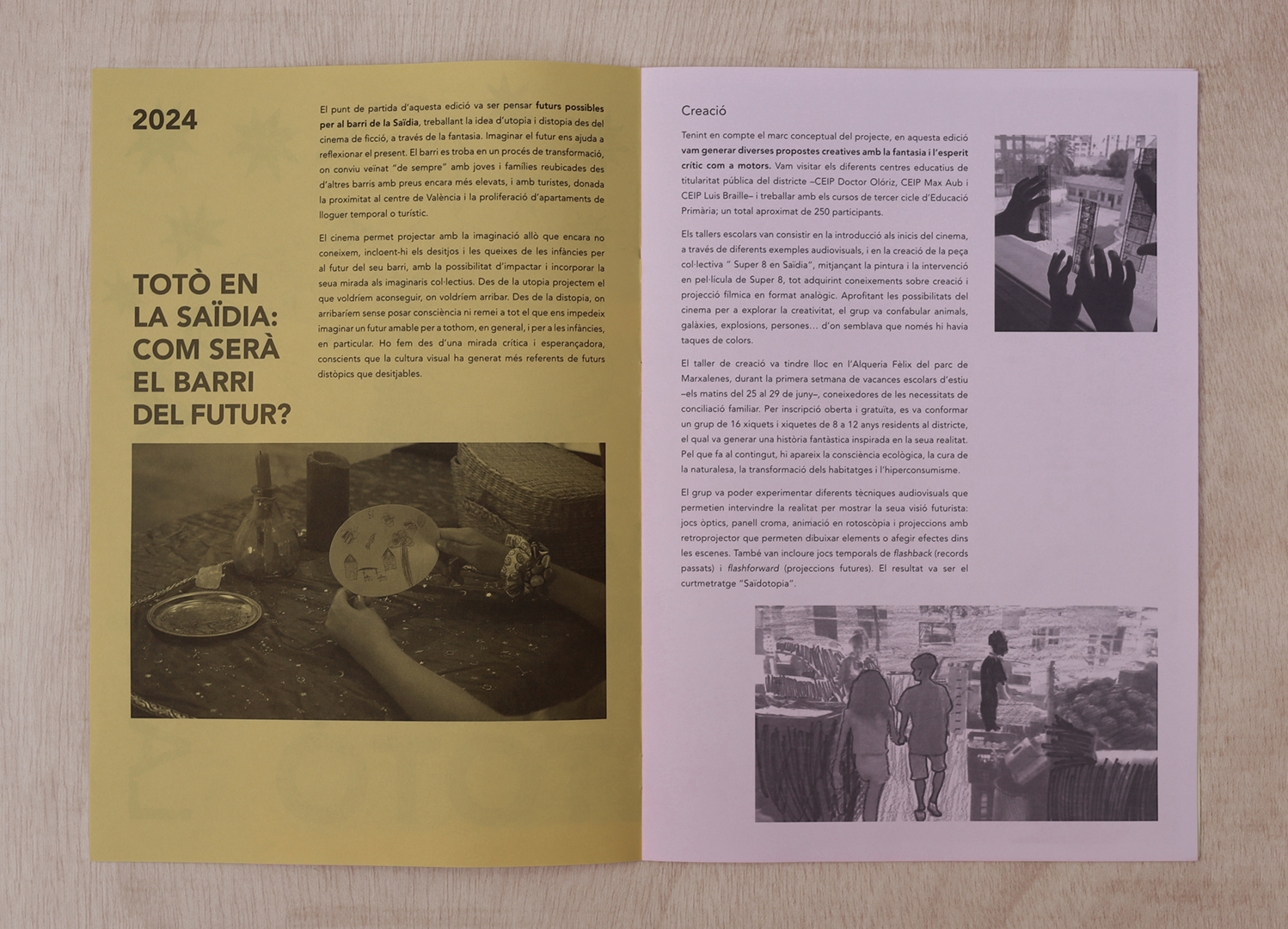 L’edició 2024, Totò en la Saïdia: com serà el barri del futur?, va treballar la idea d’utopia i distopia a partir del cinema de ficció. Amb la participació dels CEIP Doctor Olóriz, Max Aub i Luis Braille, es van realitzar tallers als centres i un taller intensiu a l’Alqueria Fèlix, d’on va sorgir el curtmetratge Saïdotopia.